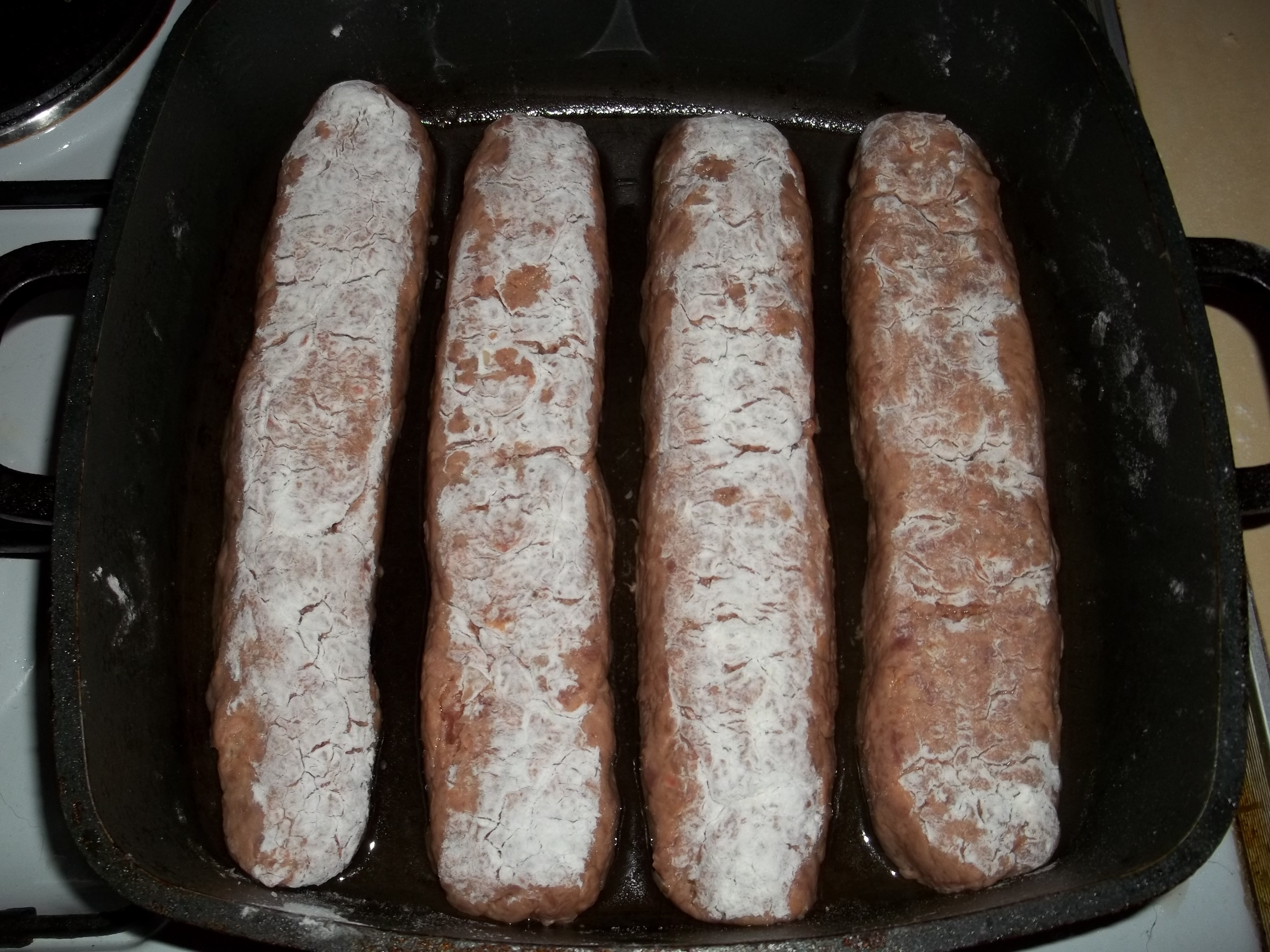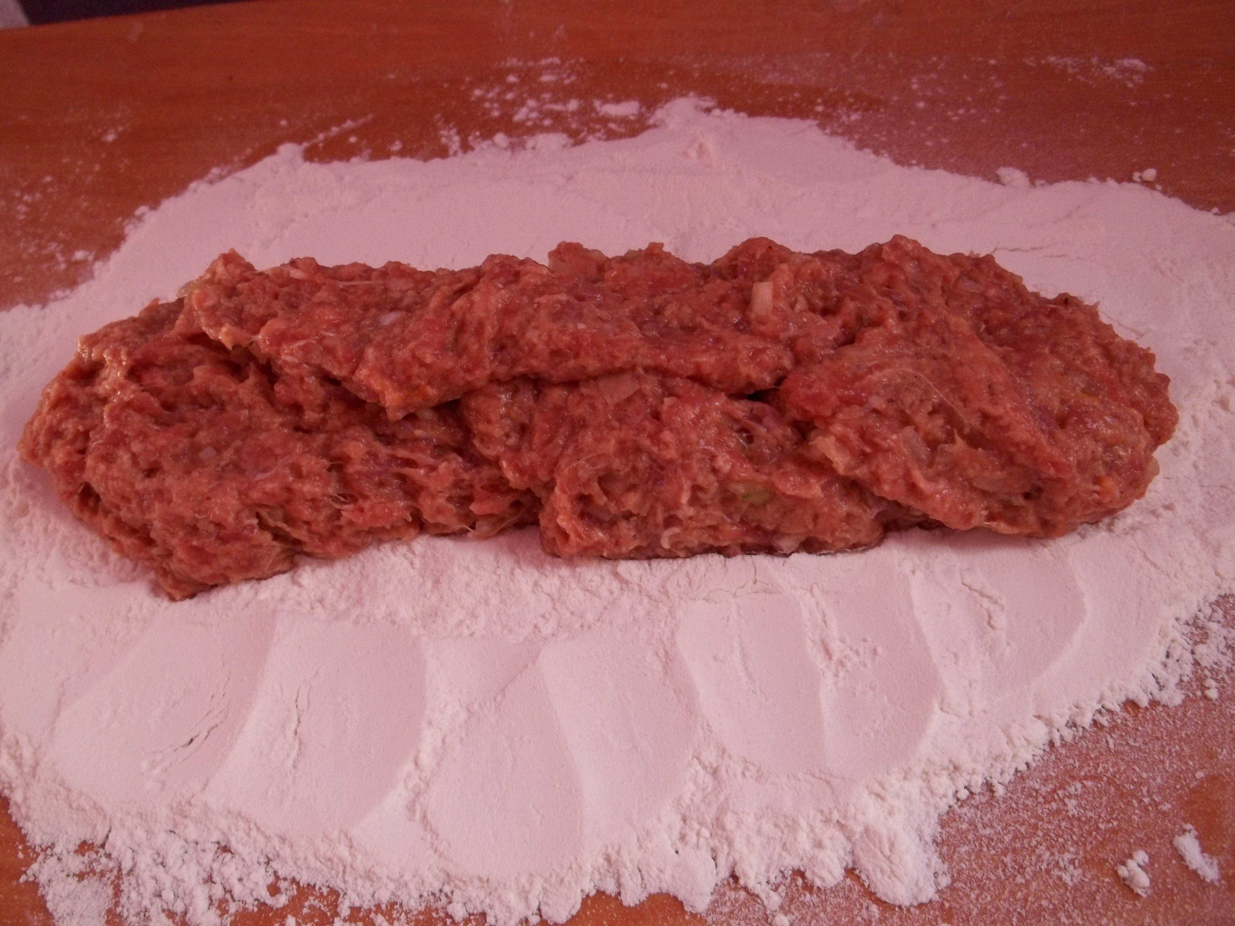 Dust a work surface with flour. Shape the kababi meat mixture into an oblong shape about 15 cm long.