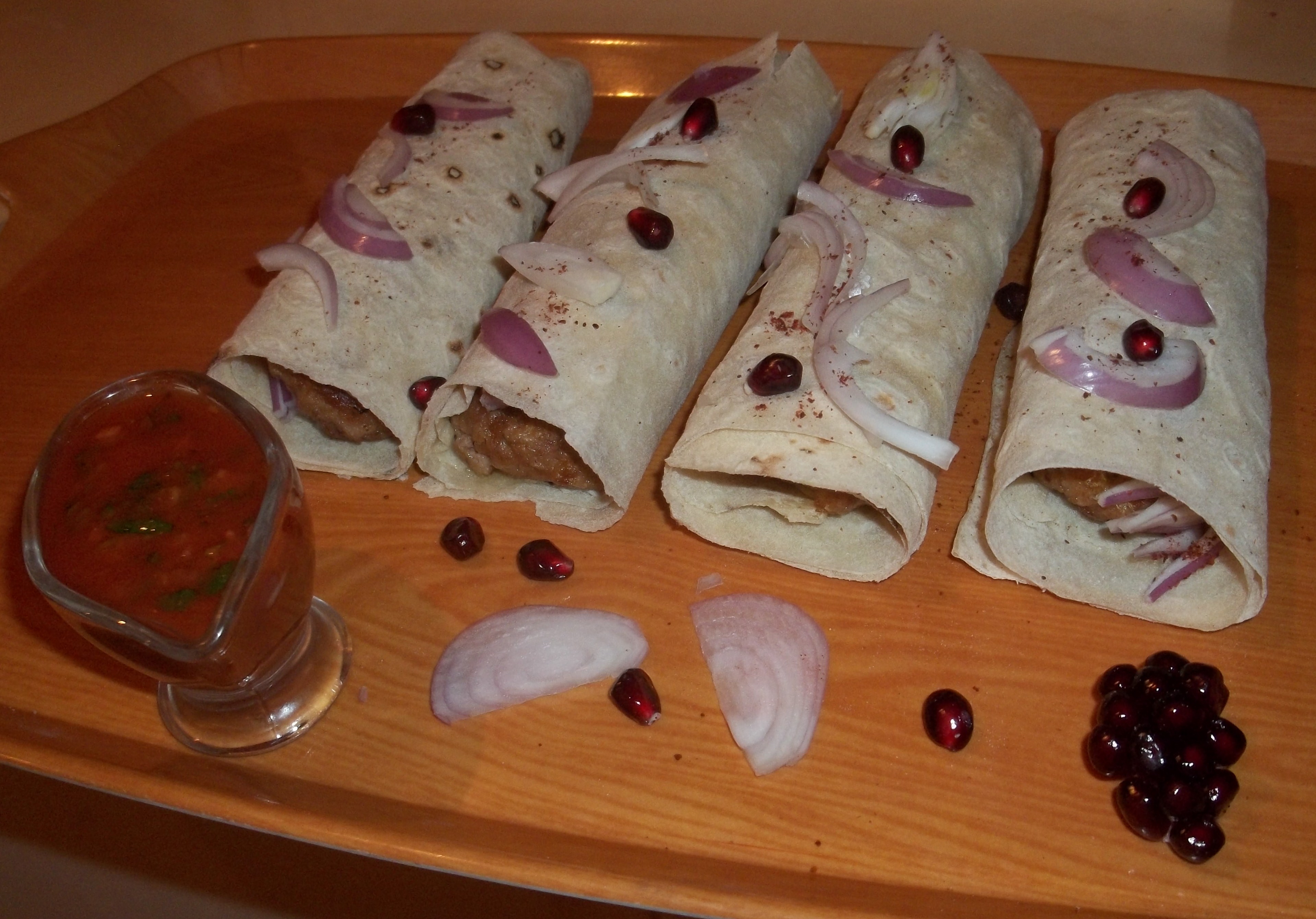 Serving: Garnish the kababi with pomegranate seeds and red onion. Serve together with the spicy tomato sauce.