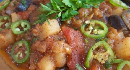 Ajapsandali (Georgian: აჯაფსანდალი) is a Georgian vegetarian/vegan dish popular as a family meal, especially in summer. There are many variations but they will always contain eggplant, potato and tomato. Click here to see another version that uses red peppers, garlic and spices. Ingredients: 600 grams of potatoes, 800 grams of eggplant (aubergine), 4 large juicy tomatoes, 3 large white onions, 2 hot … Continue reading